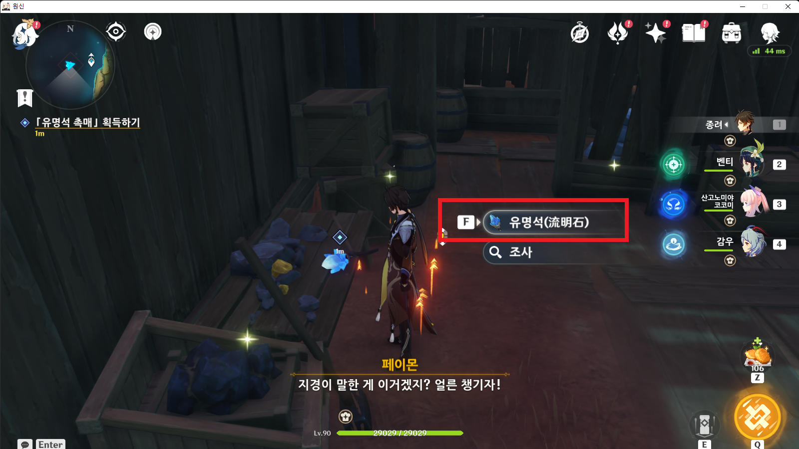 구멍으로 내려가기 전에 주변에 있는 [유명석 원석]을 획득하여 주고 구멍으로 내려가 줍니다.