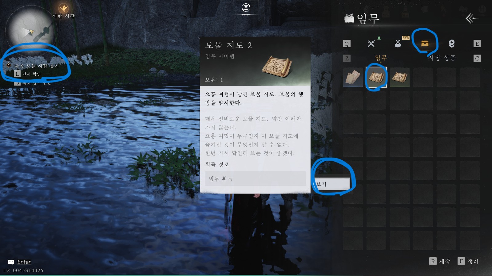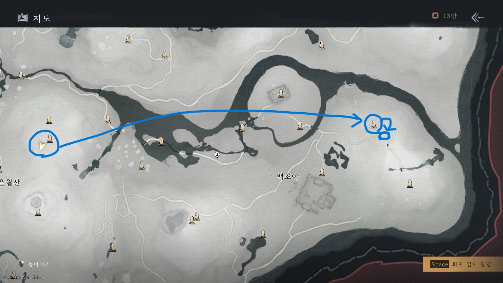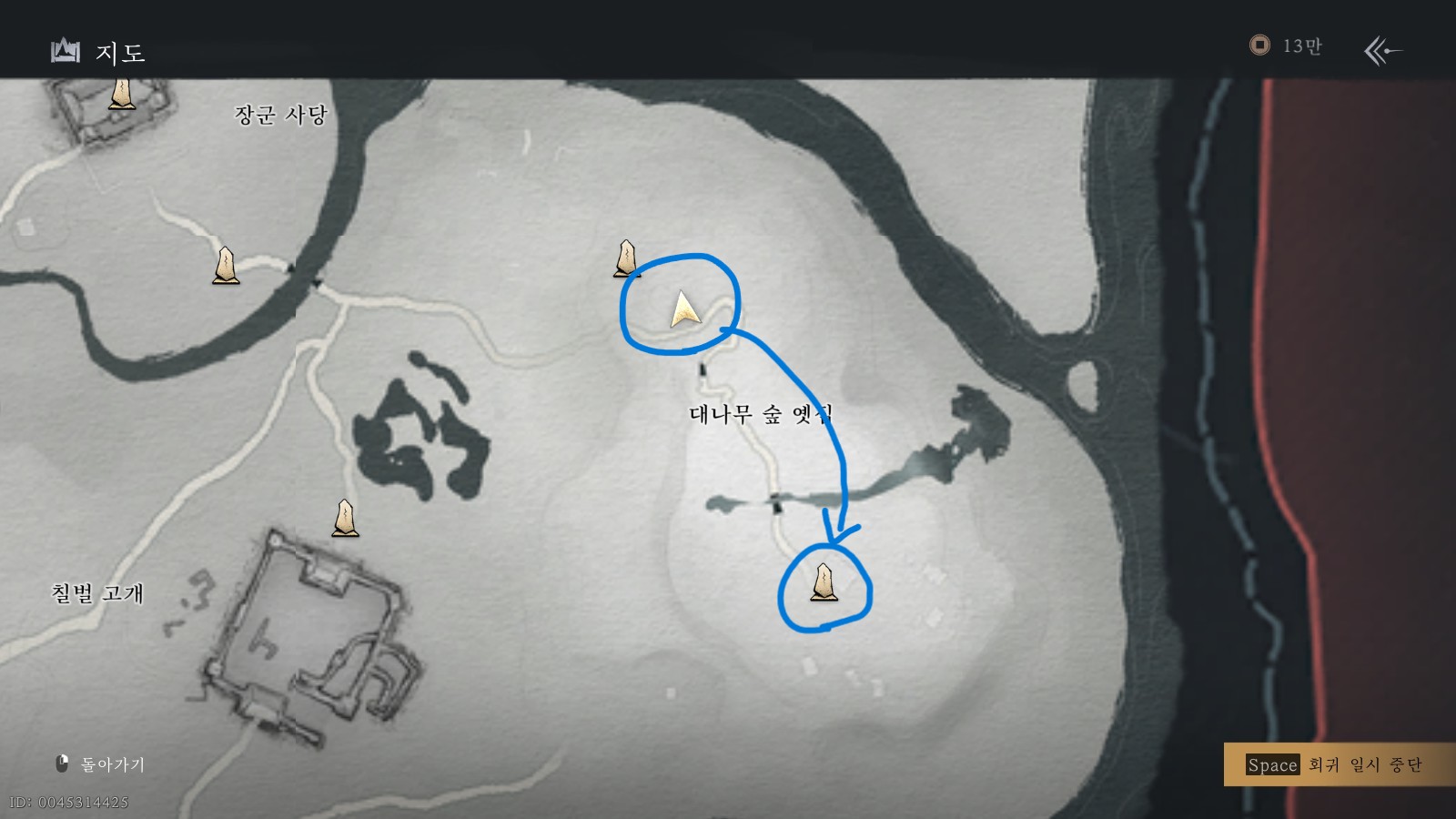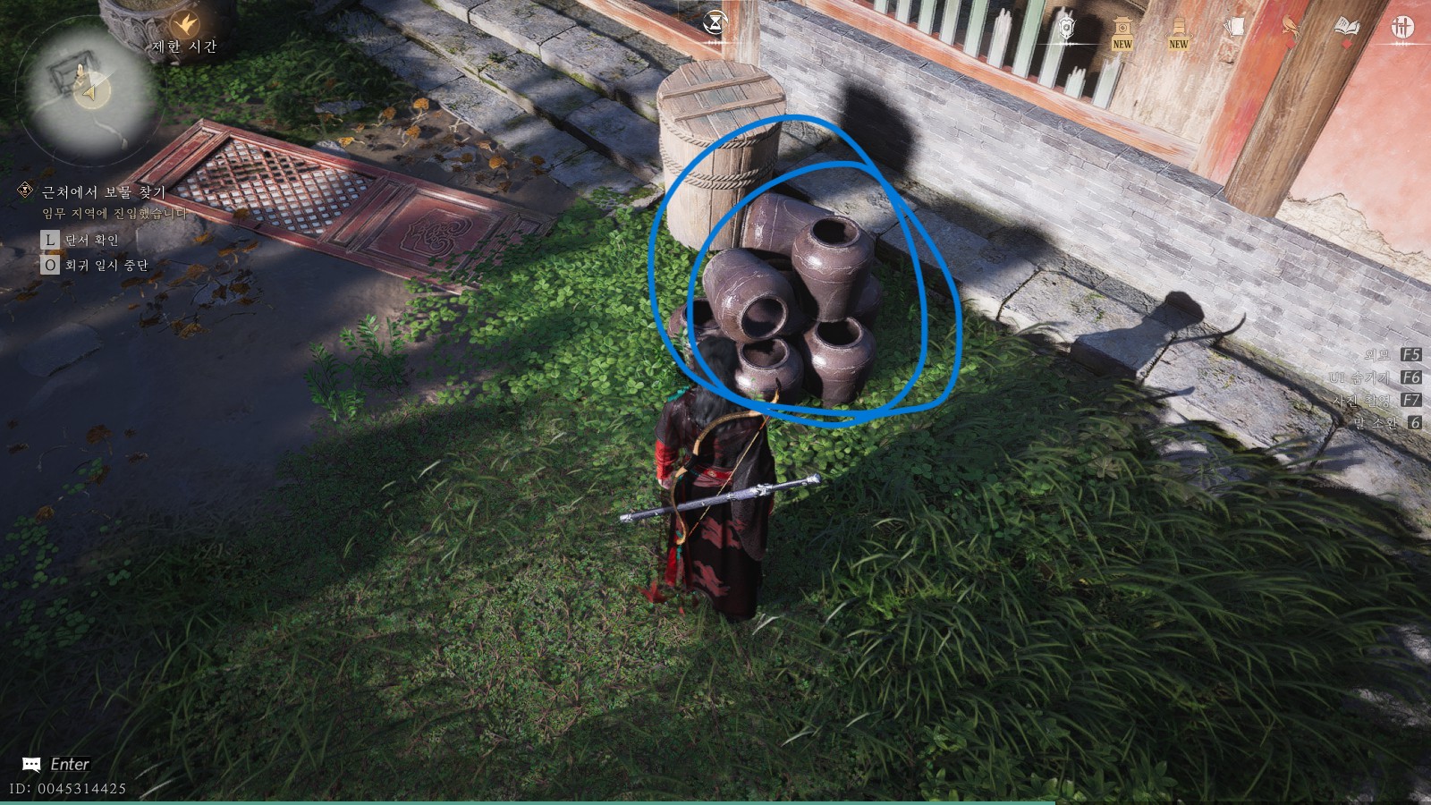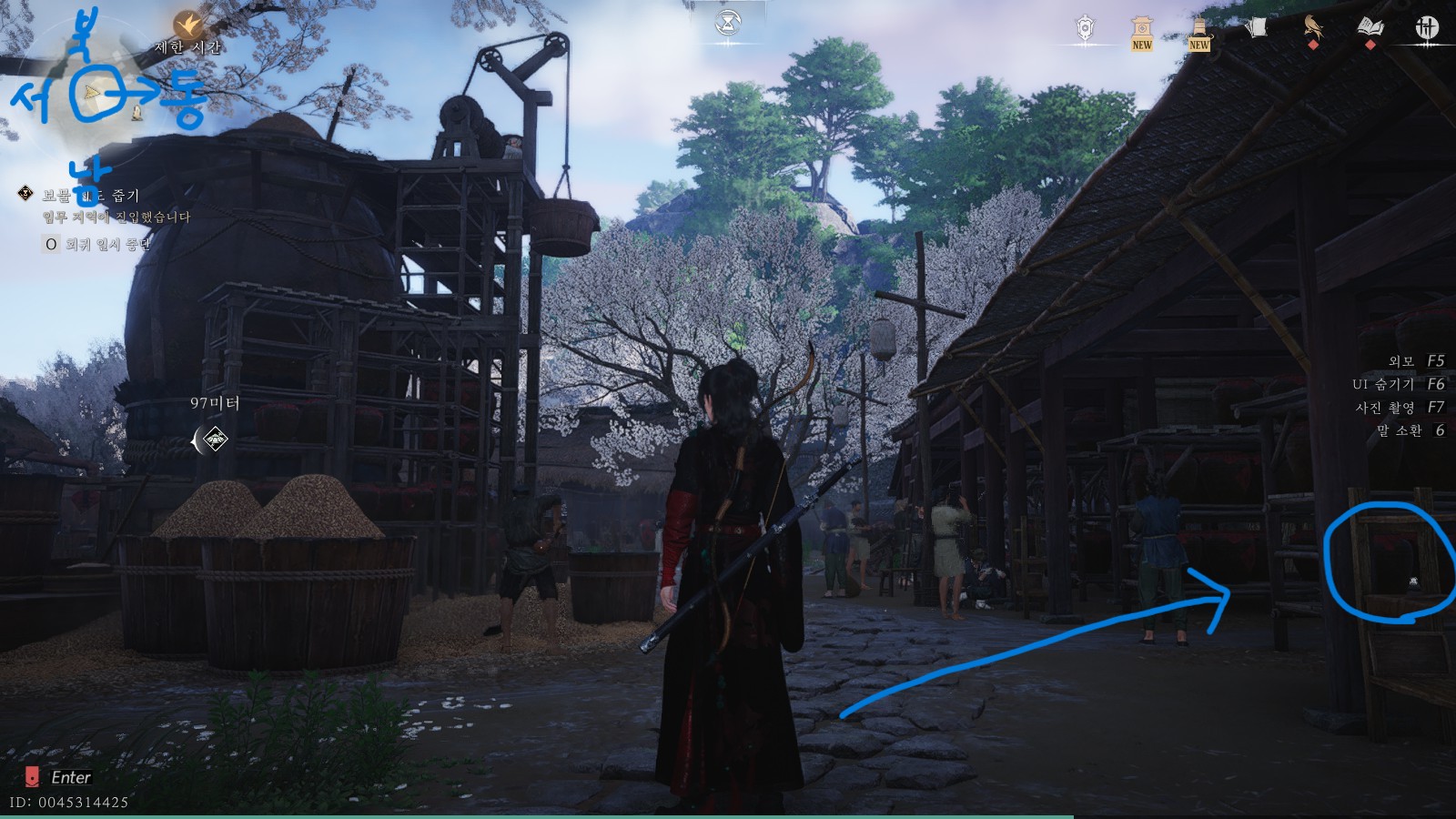 두 번째 보물지도는 지금 계신 곳의 동쪽에 위치해 있습니다. 동그라미 표시한 워프포인트로 이동하여 해당 지점으로 이동하면, 큰 대문에 들어서자마자 우측에 있는 항아리단지를 발견하실 수 있습니다.
