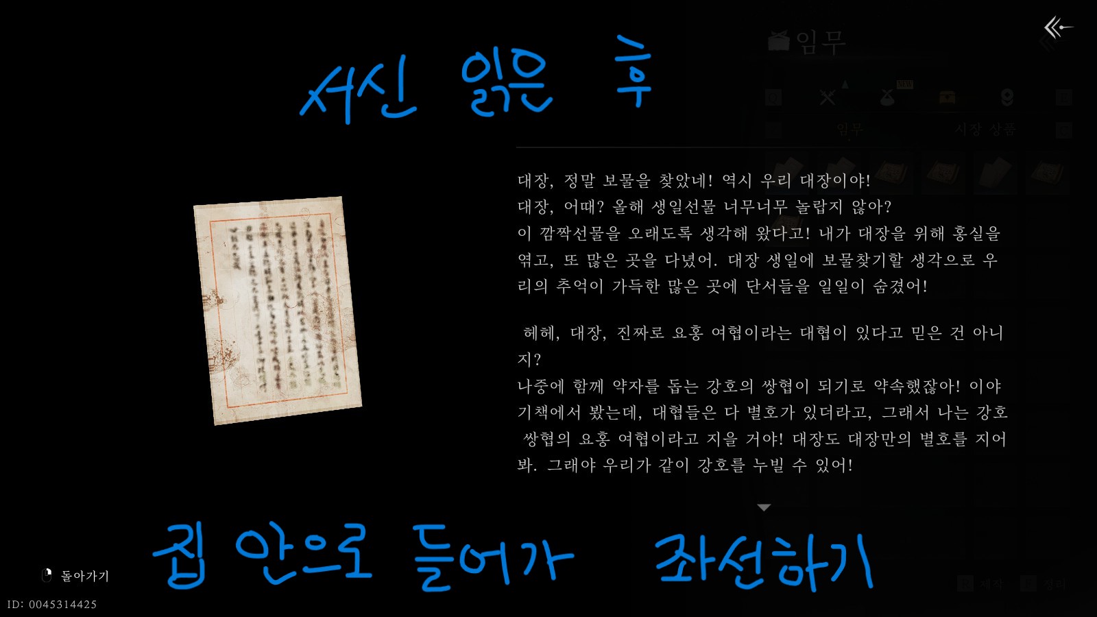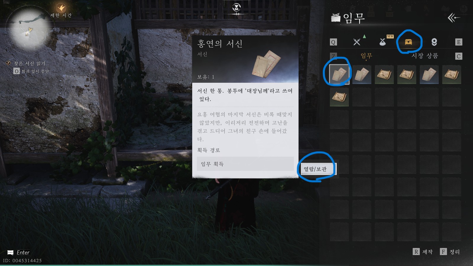 서신은 우측 동그라미 메뉴를 누른 후 [소지품] - [임무] - [홍연의 서신] - [열람/보관]메뉴를 순서대로 클릭하면 볼 수 있습니다.