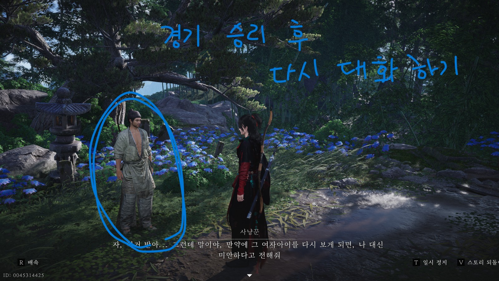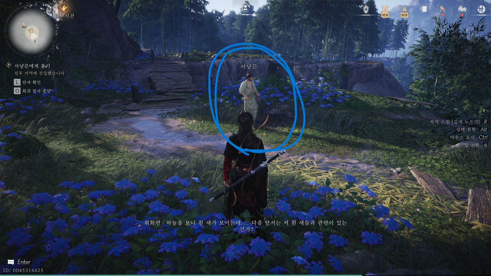 절벽을 오르면 '사냥꾼'을 발견할 수 있습니다. 사냥꾼과 대화하여 활쏘기 경기를 시작해주세요. 경기에서 승리한 후 사냥꾼에게 다시 말을 걸면, 다음 힌트를 얻을 수 있습니다.