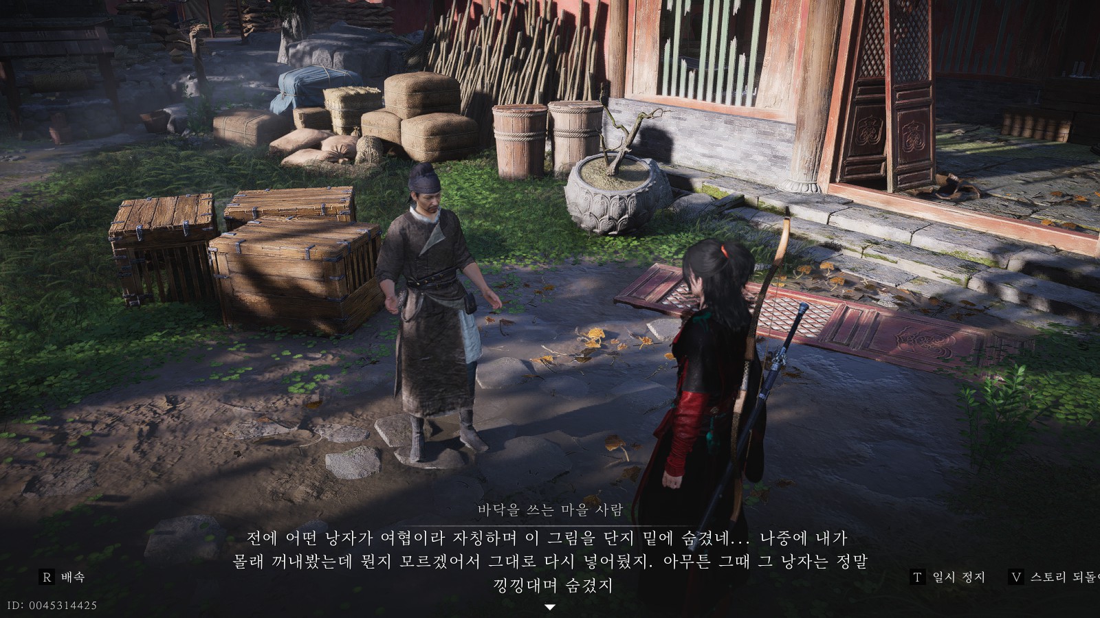 해당 항아리 단지로 다가가 무기로 단지를 부수면 다음 힌트를 발견할 수 있습니다. 힌트를 주워주시고, 바로 뒤를 돌아 '바닥을 쓰는 마을 사람'과 대화하시면 됩니다.