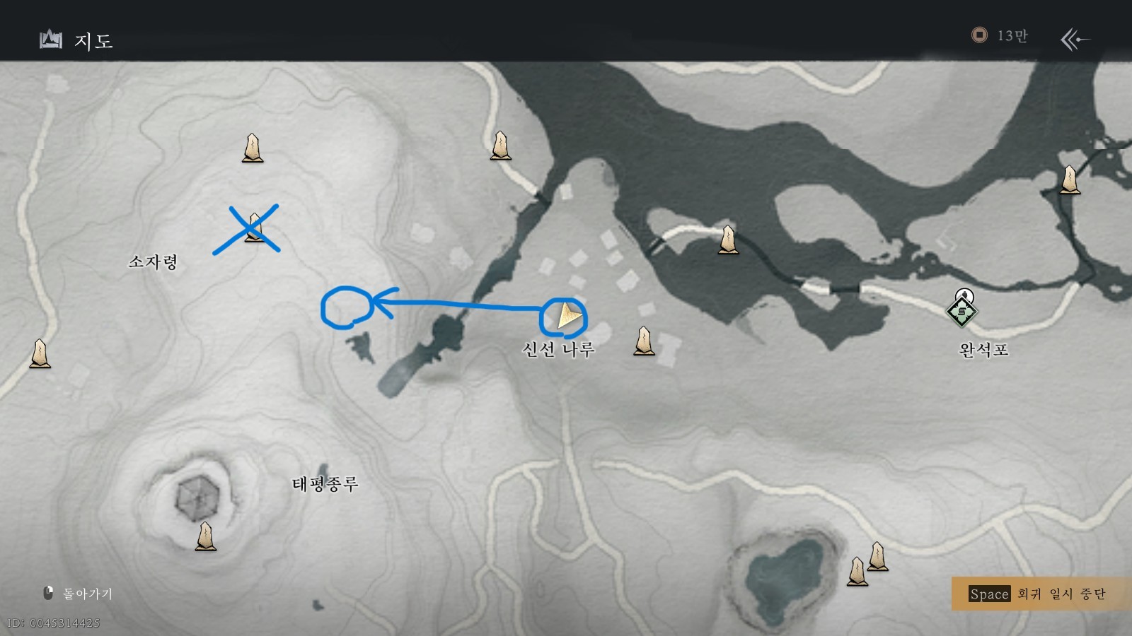 첫 번째 보물 지도 위치는 신선나루의 좌측에 위치한 곳입니다. 가까운 워프포인트로 이동할 경우 지하로 가기 때문에, 직접 이동하시거나 엑스표시 위쪽의 워프포인트를 이용하여 이동해주시기 바랍니다.