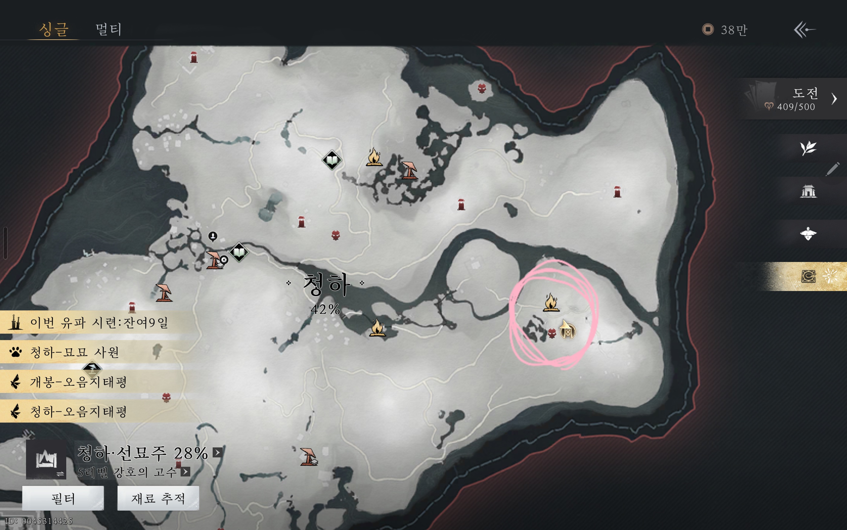 거점은 맵을 열어보시면 아래의 사진처럼 빨간 색으로 표시된 아이콘이 맵 곳곳에 있습니다. 해당 아이콘이 있는 지점으로 가서 모든 적을 처치하면 보상으로 보물상자를 얻을 수 있습니다.